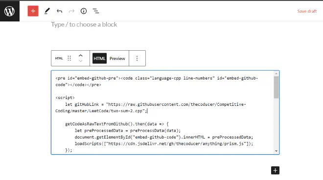 Now, create a new post and add a Custom HTML block. Paste the entire script there.