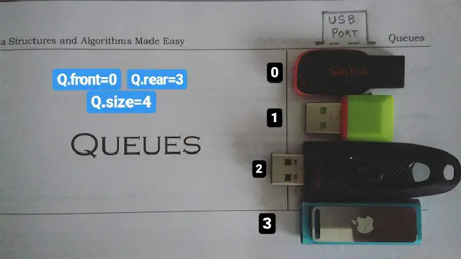 I have four USB storage devices each containing some data that I need to copy to hard drive. As an USB port can read data from a single device at a time, so I have organized them in a queue such that each device is served one after the other. Now as queue basically follows “First Come, First Serve” rule, therefore the device with index 0 being the first device to be placed in the queue must be served first and the last placed device with index 3 must be served at the last. This is how queue follows FIFO policy.