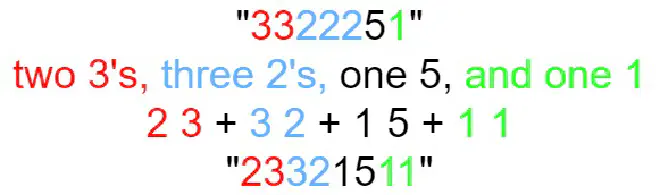 To determine how you “say” a digit string, split it into the minimal number of groups so that each group is a contiguous section all of the same character. Then for each group, say the number of characters, then say the character. To convert the saying into a digit string, replace the counts with a number and concatenate every saying.
